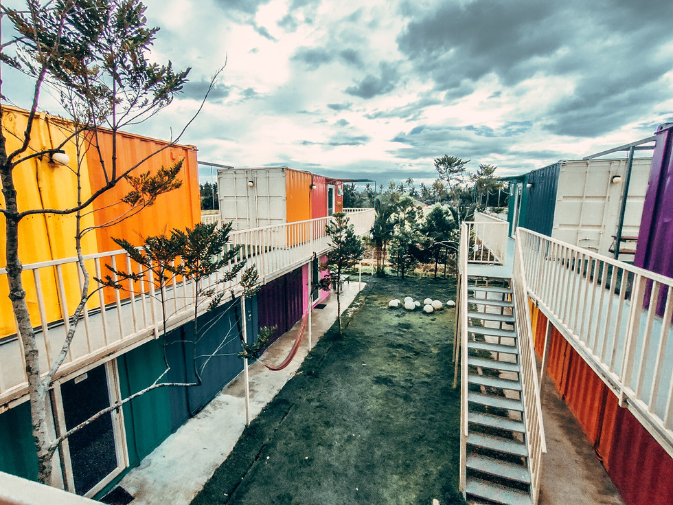 While the outside of the container building pops with vibrancy, the interiors of the rooms and common areas are designed to elude homey and airy with natural lighting spilling in.